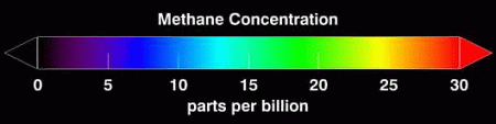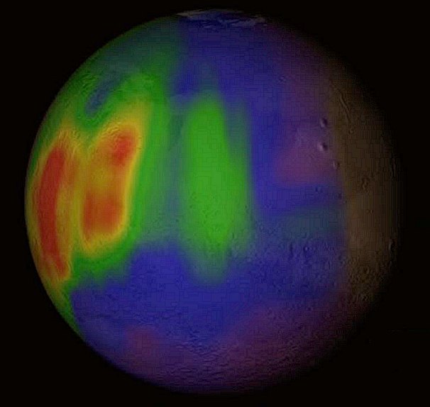 Распределение метана ( выделен красным и желтым ) в атмосфере Марса