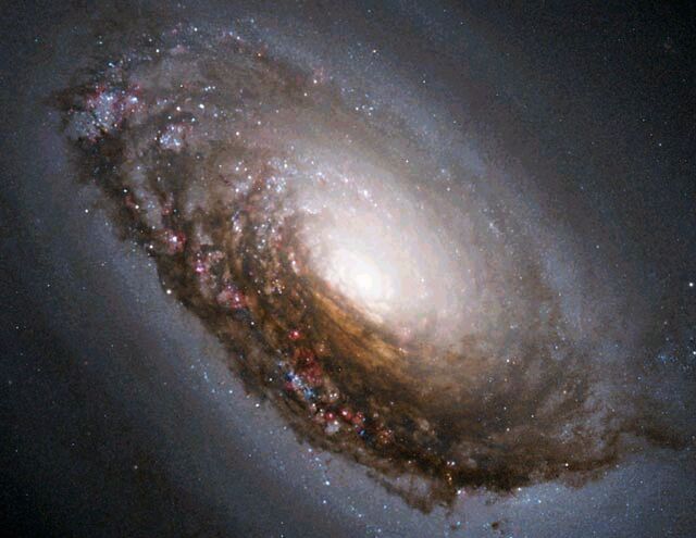 M64 ( кликнуть для увеличения ) Это - снимок галактики M64, сделанный телескопом Hubble в 2001г и опубликованный совсем недав- но. Другие названия M64 - "Черный глаз", "Дурной глаз" и "Спящая красавица". Такие названия она по- лучила из-за толстой полосы темной пыли, которая частично закрывает яркое ядро галактики. Галакти- ка M64 довольно хорошо известна среди астрономов-любителей, поскольку ее можно увидеть даже в небольшой телескоп. Находится она в созвездии Волосы Вероники на расстоянии около 17 млн. свето- вых лет от Земли. Другое обозначение галактики в каталоге - NGC 4826 . На первый взгляд, M64 представляет собой обычную спиральную галактику подобную нашей. Все звезды в ней вращаются вокруг центра галактики в одну сторону - по часовой стрелке. Однако деталь- ные исследования этой галактики показали, что облака газа, расположенные во внутренних частях галактики как из звезды вращаются по часовой стрелке, а газ во внешней части галактики вращается против часовой стрелки. В приграничной же области, где сталкиваются газовые облака, вращающие- ся в разные стороны, идет активное образование новых звезд. Указывают на это видимые на снимке горячие молодые голубые звезды и розоватые облака водорода, светящегося под действием ультрафио- летового излучения новых звезд. Галактика в основном сформирована звездами среднего возраста вто- рого поколения. Астрономы полагают, что более миллиарда лет назад галактика M64 поглотила соседнюю мелкую га- лактику, от которой сейчас остался только газ, вращающийся в противоположную сторону относитель- но ядра M64. Внутренняя часть диска имеет радиус около 3000 световых лет, а внешний диск - не менее 40000 световых лет и вращается с угловой скоростью ~ 300 км /сек. M64 обнаружена Эдвардом Пиготтом 23.03.1779 г, годом позже, Чарльз Месье ( Charles Messier ) неза- висимо повторно обнаружил эту галактику 1.03.1780 г и каталогизировал её как M64. Однако, откры- тие Пиготта более или менее игнорировалось и восстановлено Брином Джонсом лишь в апреле 2002г. www.astronet.ru/db/msg/1196503