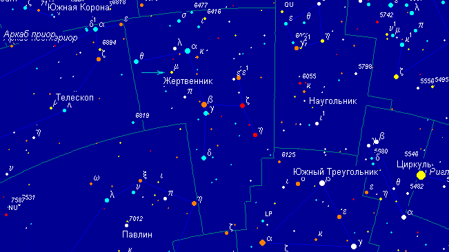 Mu Arae (спектральный тип G3 V-IV) - солнце-подобная звезда 5-й звездной величины (видна не-